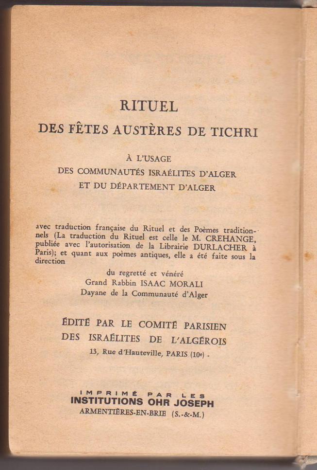 .ספר זה, הינו החלק השני של "מחזור לימים נוראים" (לראש השנה וליום כיפור), שהגיע לארץ מאלג'יריה ונדפס בליוורנו